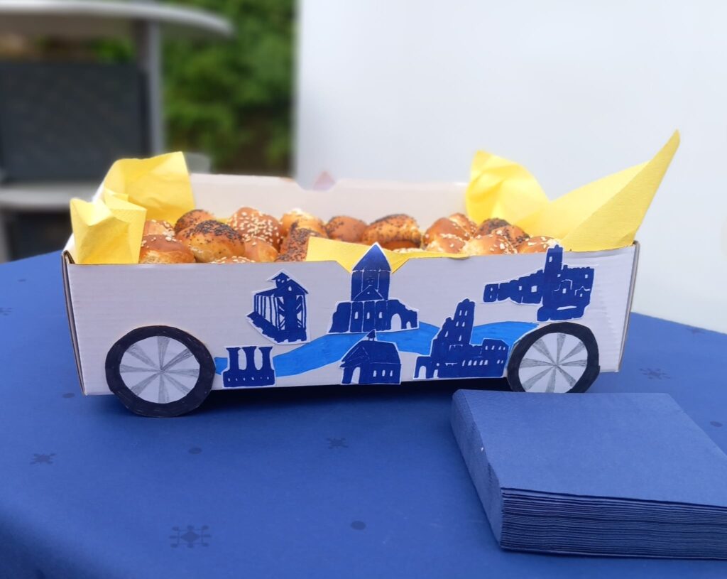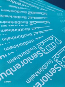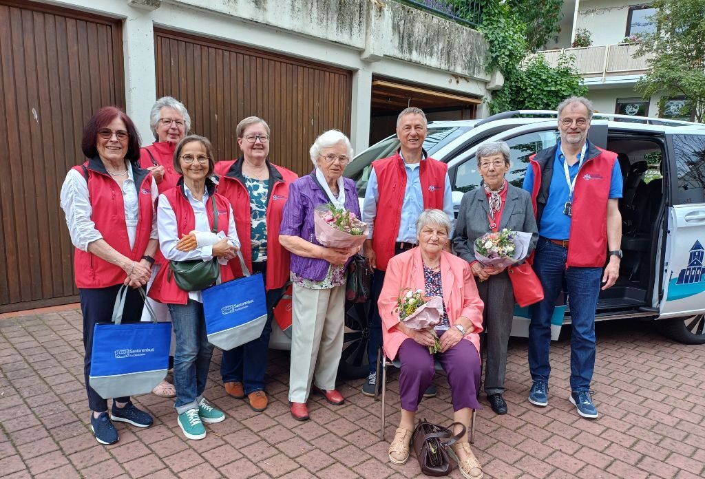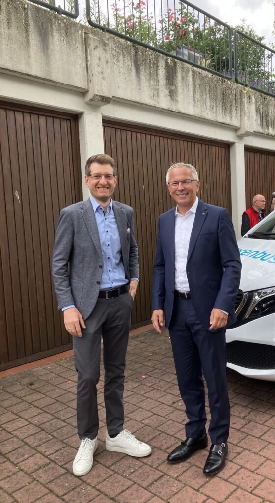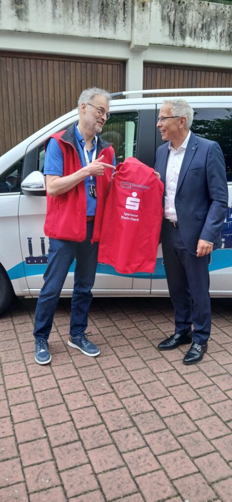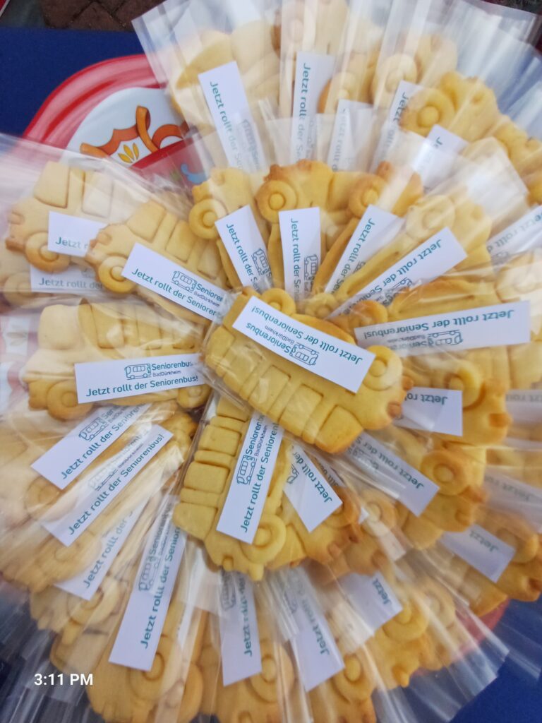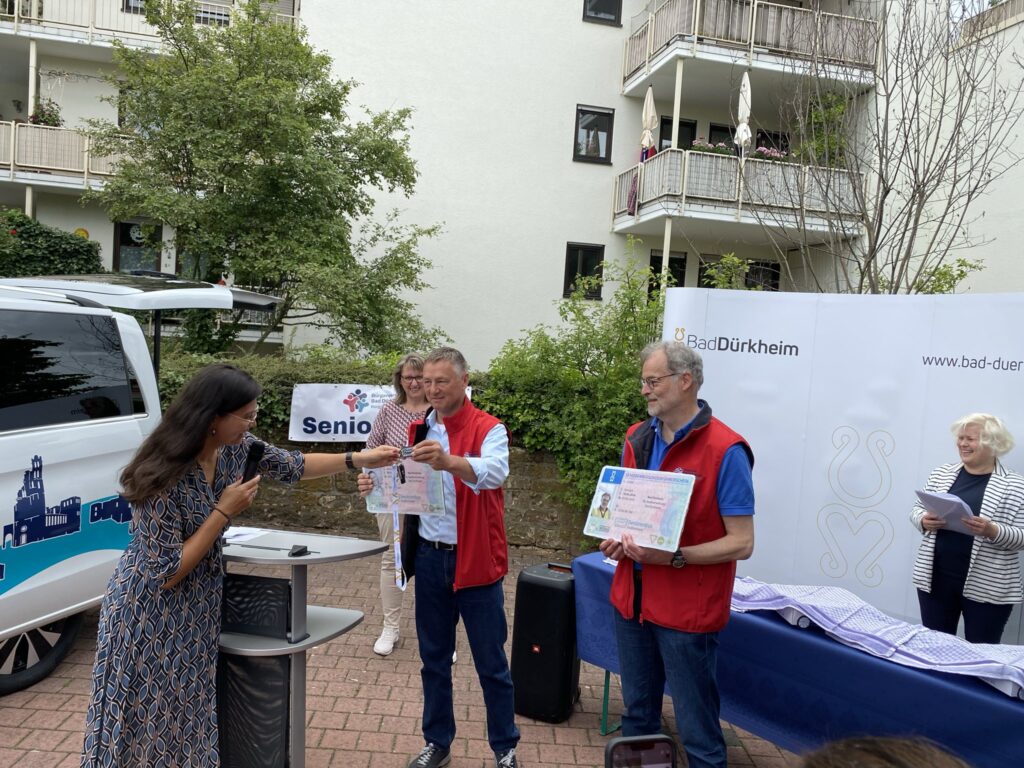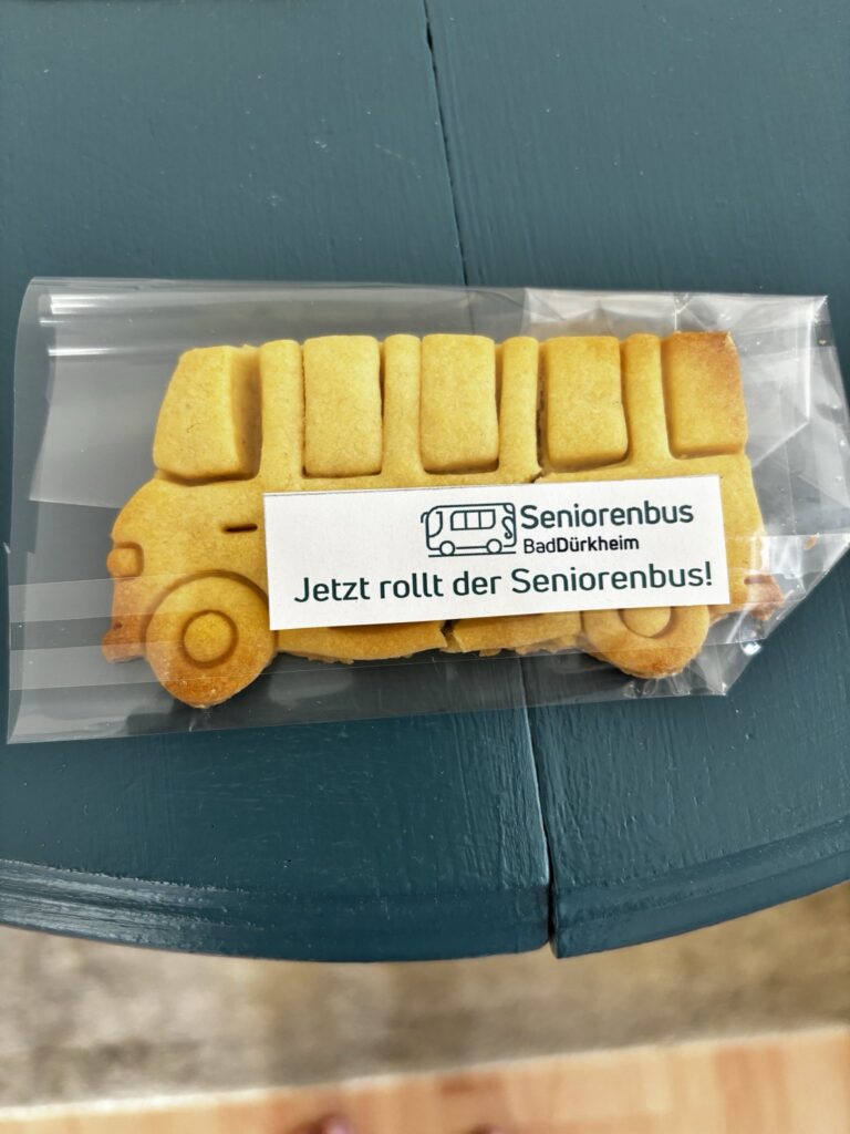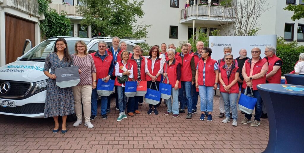 Feierliche Übergabe des Fahrzeugs am 5. Juni 2025 Juni 8, 2025Juni 8, 2025 Auf dem Foto der komplette Vorstand, unsere Kassenprüferinnen sowie die ersten Fahrgäste zu sehen.Die Stadtverwaltung hat sich wirklich ins Zeug gelegt und die Übergabe des Fahrzeugs in einer Feierstunde sehr gut organisiert. Die Sachgebietsleiterin Frau Schneider-Joseph und ihr ganzes Team sind einfach Spitze!In den einzelnen Reden wurde noch einmal allen gedankt die an der Realisierung des Projekts „Bad Dürkheimer Seniorenbus“ beteiligt waren. Den Presseartikel finden Sie hier.Drei Fahrgäste aus Ungstein, die sich zuerst für eine Fahrt angemeldet hatten, bekamen einen Blumenstrauß überreicht. Liselotte Schwalb, Renate Haeusler und Hanna Tempel, hatten sich bereit erklärt an der Feierstunde teilzunehmen.Das Fahrzeug für das wir offiziell den Schlüssel überreicht bekommen haben, ist ein Elektro Kleinbus Mercedes Benz EQV 300. Feierliche Übergabe des Fahrzeugs – Unser Team in den neuen roten Westen Übergabe des Schlüssels von Bürgermeisterin Bauernschmitt an den 1. Vorsitzenden des Bürgervereins Horst Bäuml Von Frau Schneider-Joseph selbst gebackene „Seniorenbusse“ Unsere drei Fahrgäste die sich zuerst angemeldet hatten Seniorenbus als Gebäck Winzer-Snack in gebastelten Kartons Der Seniorebusflyer als Fächer aufgereiht Die Sparkasse Rhein-Haardt hat unsere roten Westen bezuschusst Die Vertreter von VR Bank Mittelhaardt und Sparkasse Rhein-Haardt die für das Fahrzeug an die Stadt Bad Dürkheim gespendet haben